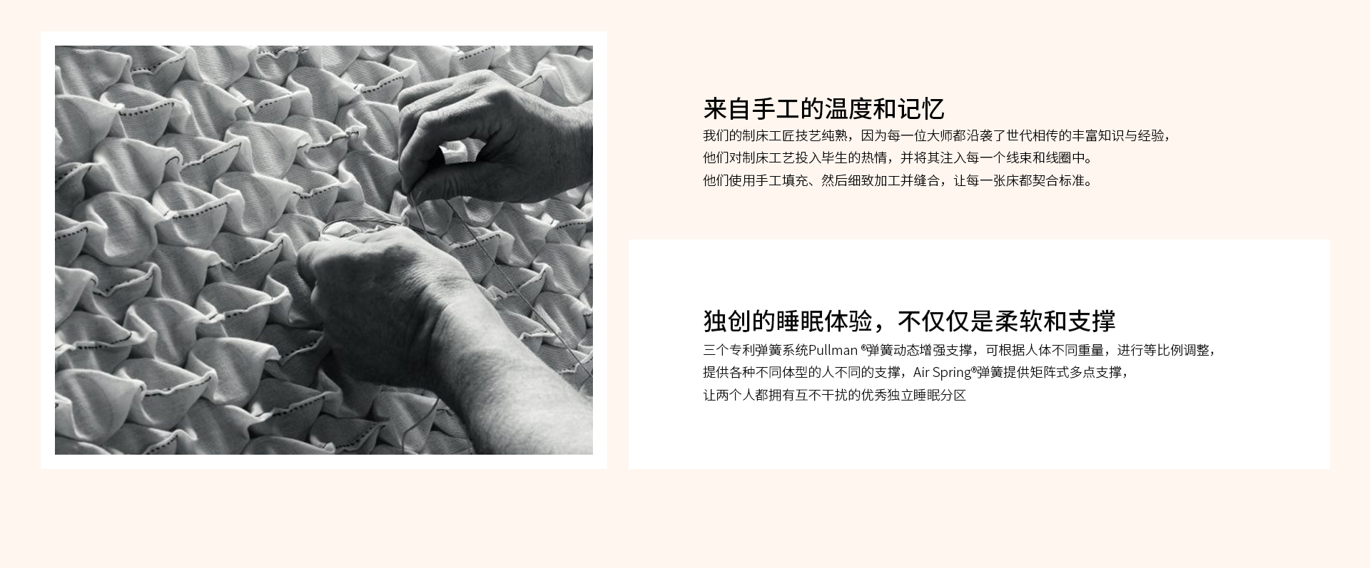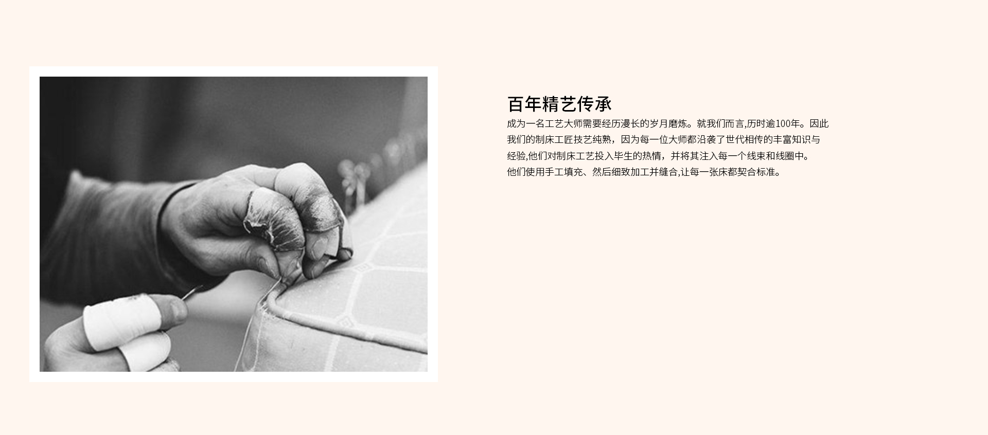 成为一名工艺大师需要漫长的岁月磨炼。对于我们而言,历时逾百年。因此我们的制床工匠技艺纯熟,因为每一位大师都沿袭了世代相传的丰富知识与经验,他们对制床工艺投入毕生热情,并将其注入每一个线束和线圈中。他们使用手工填充,然后细致加工并缝合,让每一张床垫都契合标准。